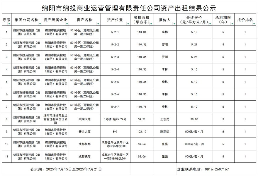 綿陽(yáng)市綿投商業(yè)運(yùn)營(yíng)管理有限責(zé)任公司資產(chǎn)出租結(jié)果公示