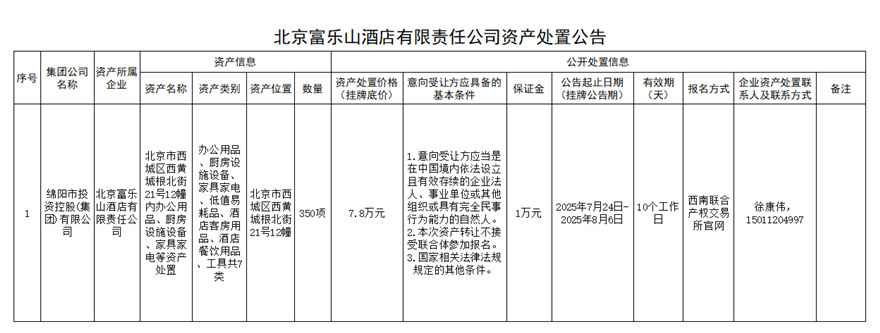 北京富樂(lè)山酒店有限責(zé)任公司資產(chǎn)處置公告