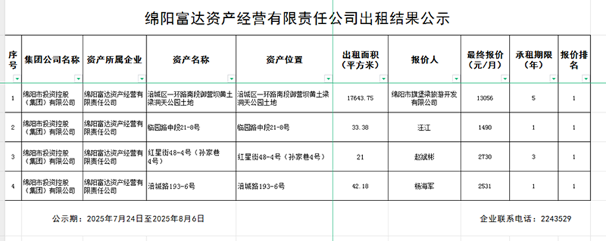 綿陽富達資產(chǎn)經(jīng)營有限責任公司出租結(jié)果公示