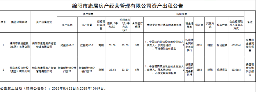 綿陽市康居房產(chǎn)經(jīng)營管理有限公司資產(chǎn)出租公告