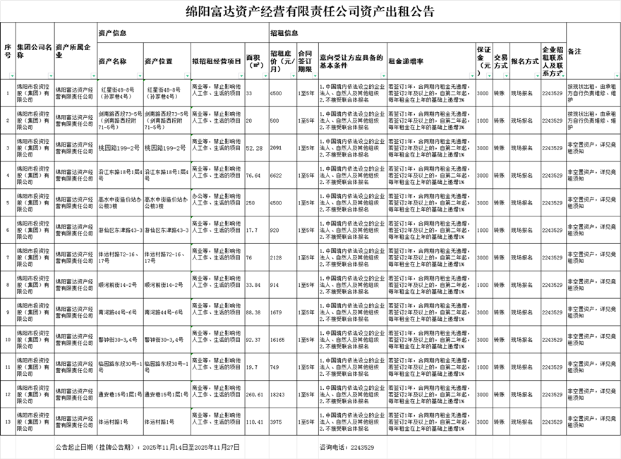 綿陽(yáng)富達(dá)資產(chǎn)經(jīng)營(yíng)有限責(zé)任公司資產(chǎn)出租公告