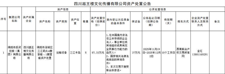 四川越王樓文化傳播有限公司資產(chǎn)處置公告