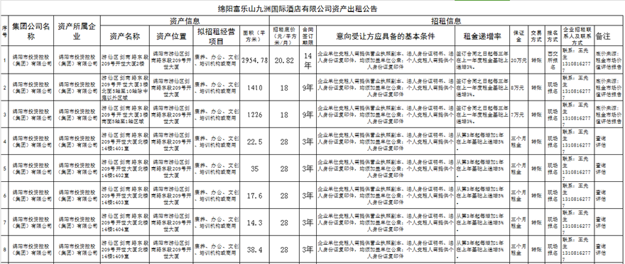 綿陽(yáng)富樂(lè)山九洲國(guó)際酒店有限公司資產(chǎn)出租公告